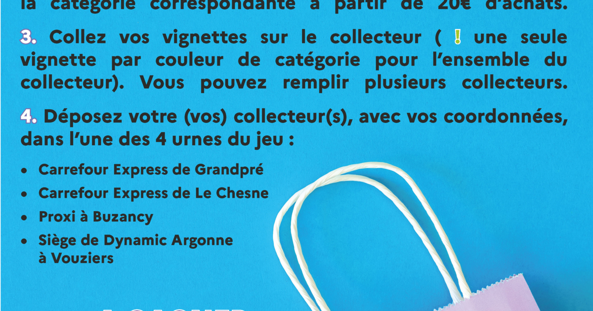 4. déposez votre collecteur, avec vos coordonnées, dans l’une des 4 urnes du jeu : Carrefour Express de Grandpré, Carrefour Express de Le Chesne, Proxi à Buzancy, siège de Dynamic Argonne rue Chervin à Vouziers.