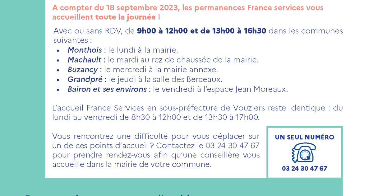 L’accueil France Services en sous-préfecture de Vouziers reste identique : du lundi au vendredi de 8h30 à 12h00 et de 13h30 à 17h00.