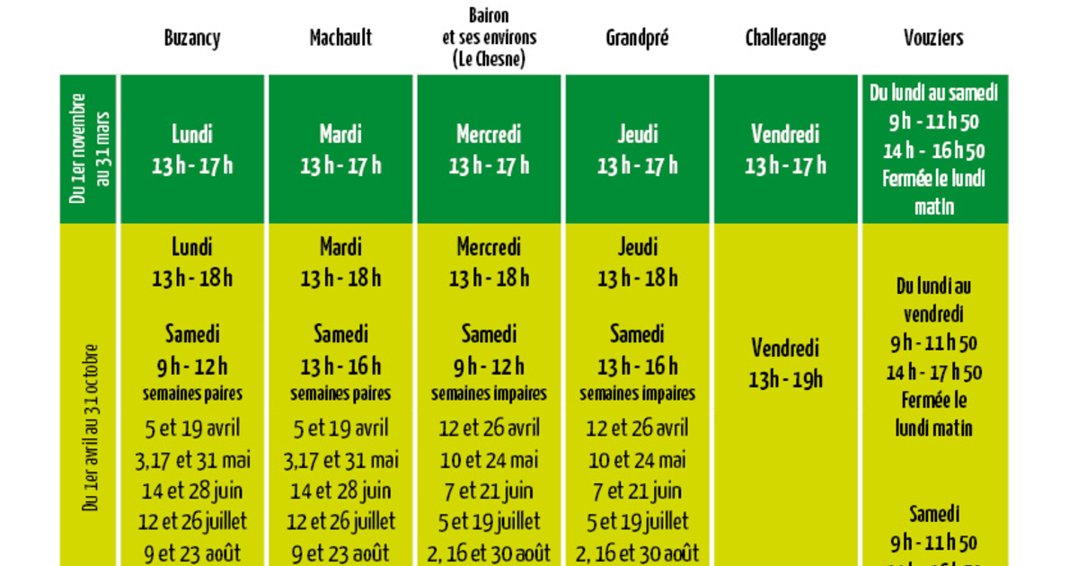 • Déchèterie de Challerange : entre le 1er avril et le 31 octobre, ouverture uniquement le vendredi, de 13 h à 18 h.