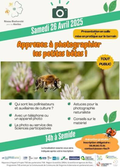 Cet atelier propose une présentation des insectes pollinisateurs et des auxiliaires de culture (en salle), suivie sur le terrain d'une formation aux techniques de photographie naturaliste.Même avec un simple smartphone, apprenez à réaliser de jolis clichés et mettez la photo au service des sciences participatives ! GRATUIT - Inscription obligatoire auprès du Réseau Biodiversité pour les Abeilles (le lieu de RDV vous sera précisé à l'inscription) Cette animation entre dans le cadre du programme Trame Verte et Bleue de la Communauté de Communes de l'Argonne Ardennaise