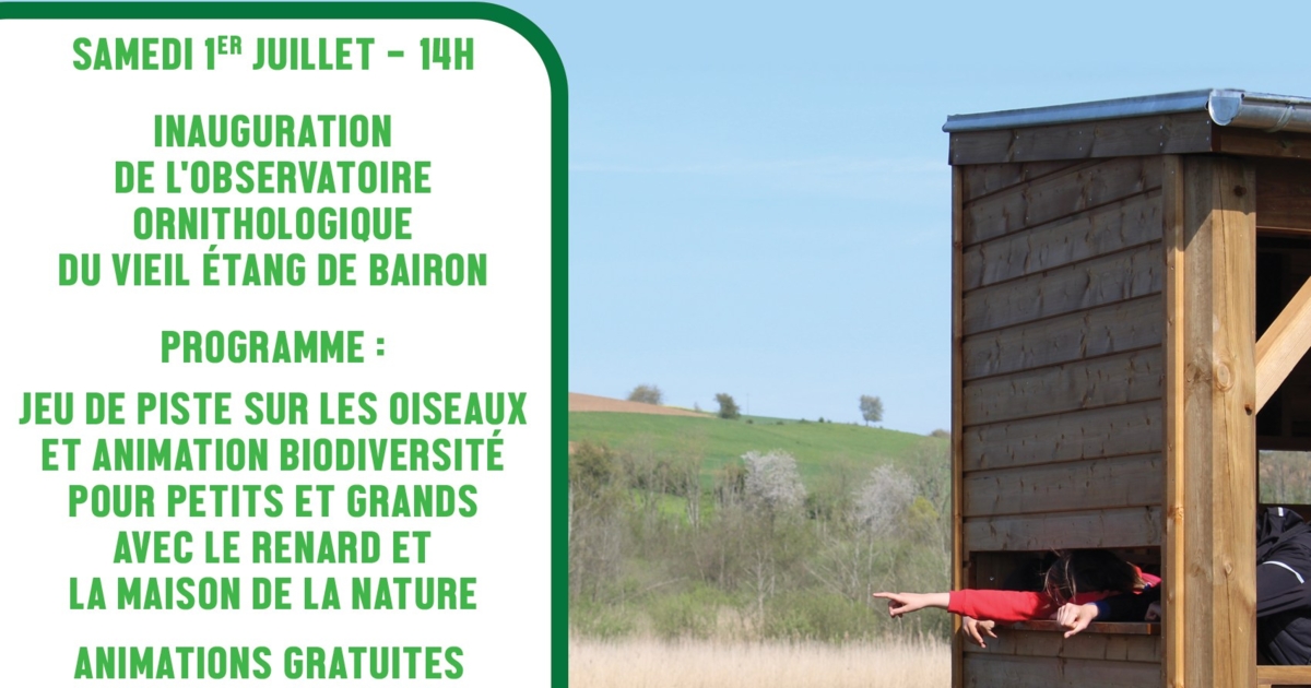 Venez assister à l'inauguration de l'observatoire ornithologique du vieil-étang de Bairon le samedi 1er juillet ! À cette occasion, vous pourrez prendre part à différentes animations proposées par le ReNArd et la Maison de la Nature jusqu'à 17h !