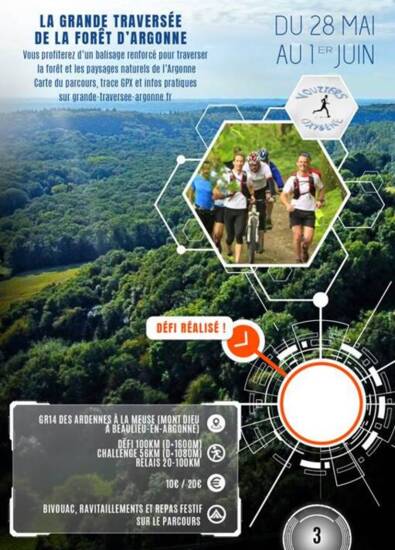 Départ du Mont-Dieu (Ardennes) - arrivée à Beaulieu-en-Argonne (Meuse) - 1 à 2 jours d'aventure en trail, VTT ou rando- Défi 100km 1600 mètres de D+ (en 1 jour, 2 jours, en relais ou en parcours libre sur 3 à 5 jours) - Relais 20-100km - Ravitaillements, bivouac et repas festif sur le parcours- Un parcours nature entre forêts, étangs et villages de caractère.De village en village, des forêts et milieux naturels aux patrimoines de la Grande Guerre… Suivez le balisage renforcé et explorez l’Argonne à votre rythme !