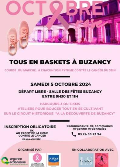 Course ou marche : à chacun son rythme contre le cancer du seinDépart libre - salle des fêtes de Buzancy entre 9h30 et 11hParcours de 3 ou 5 kmsAtelier pour bouger tout en se cultivant sur le circuit historique " A la découverte de Buzancy"Inscription obligatoire : 5€ au profit de la ligue contre le cancer